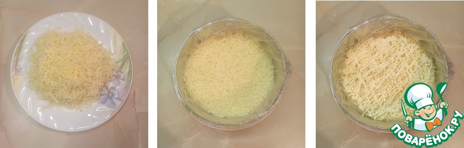 Последним слоем выложить белки, натертые на мелкой терке.