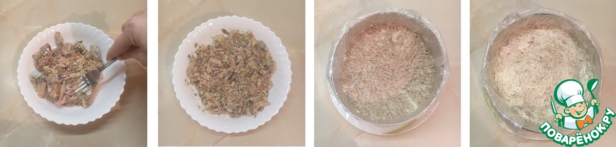 С консервов слить лишнюю жидкость, выложить их в тарелку и размять вилкой до однородности. Выложить на сырный слой и сверху смазать майонезом.