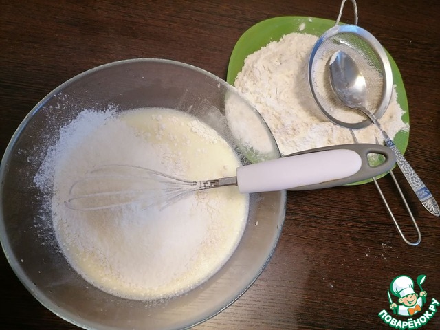 Добавьте масло и молоко, тщательно перемешайте. Добавьте просеянную муку. Замешайте тесто. Оно должно получиться немного густоватым, как жидкая сметана. Если у вас в процессе в тесте образовались комочки, процедите его через сито.