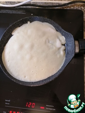Разогрейте сковороду (у меня блинница), вылейте первую поварежку теста и аккуратно распределите тесто. Лучше это делать на слегка подогретой сковороде, так проще будет разливать блин, так как он не будет быстро выпекаться на сковороде в процессе литья.