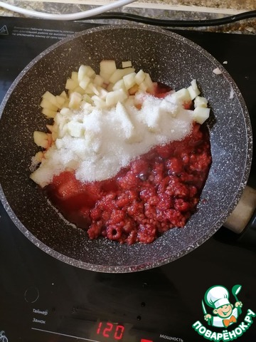 Замороженную малину опустите в сковороду и поставьте на слабый огонь. Яблоки очистите и порежьте. Как только малина слегка развариться, добавьте к ней яблоки и сахар. Накройте плотной крышкой и продолжайте томить.