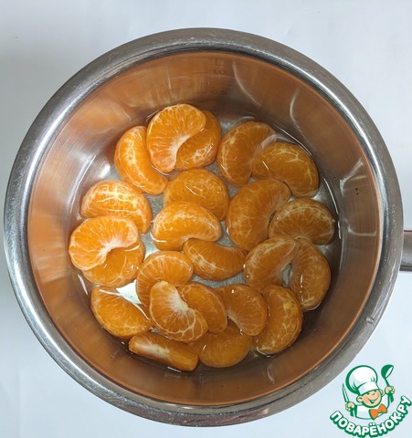 В первую очередь надо подготовить мандарины, почистить и удалить все белые "волосики". В небольшом сотейнике залить мандарины водой так, чтобы она только покрыла их. Поставить на огонь, довести до кипения и варить 25-30 минут.