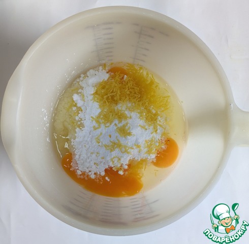 К яйцам добавить сахарную пудру и цедру лимона, взбить до однородности.