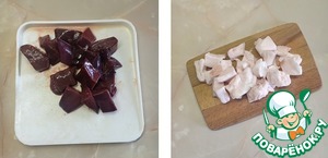 Печень и свиное сало вымыть и нарезать на средние кусочки.