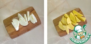 Лук и картофель вымыть, очистить и нарезать на четвертинки.