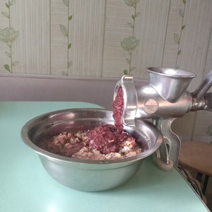Печень, картофель, сало и лук пропустить через мясорубку.