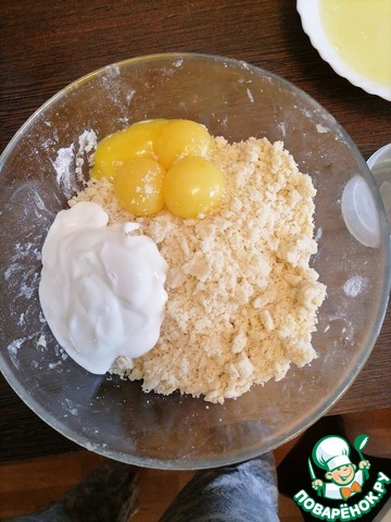 Разотрите масло с 2/3 муки, затем добавьте желтки и сметану.
