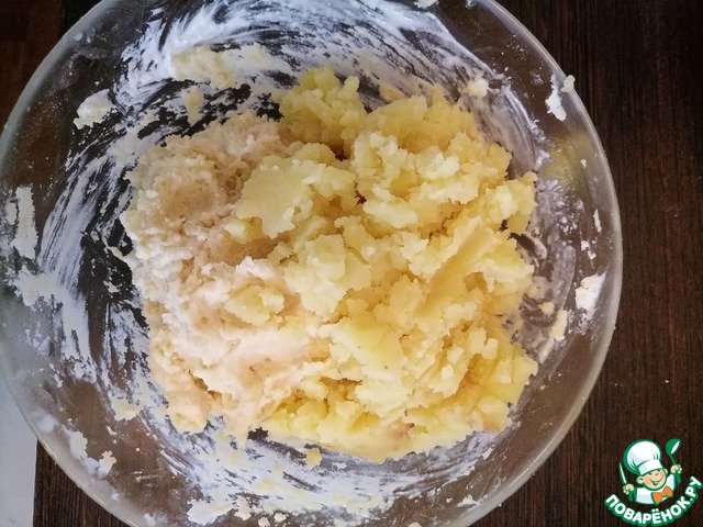 Отваренный картофель остудите, разотрите в пюре и добавьте в тесто. Посолите по вкусу.