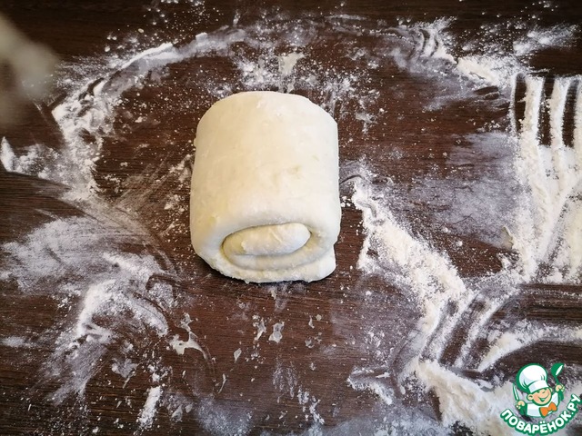 Хорошо замешайте тесто и оставьте в холодильнике на 30 минут. Затем тесто раскатайте на столе, сверните в рулет-улитку и уберите в холодильник на 30 минут. Повторите эту процедуру 2 раза.