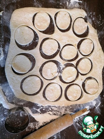 Раскатайте тесто в тонкий пласт, вырежьте кружки. Каждый кружок обмакните во взбитый белок и положите на пергамент, смазанный маслом.