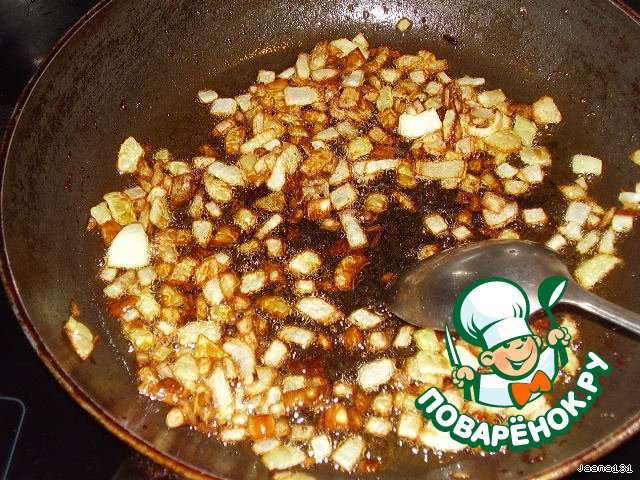 • Почистить луковицу и порезать кубиками. Поджарить до прозрачности. (у меня малость пережарился пока детей гоняла)