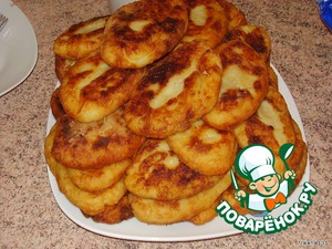 • Положить в углубление 1 десертную ложку с горкой, но не большой, начинки. Защипнуть край, как у пирожков. Аккуратно позажимать между ладоней, сложенных лодочкой. Потом, перед тем как положить на сковороду, небольшим нажатием прижать. Все надо делать в большом количестве муки. И аккуратно, тесто не эластичное.