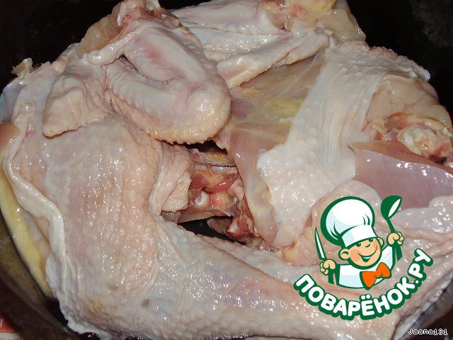 Короче суповая (можно бройлера). Ее помыть, порезать и залить водой. Посолить. Я варю в печке, экономлю... (А бройлер варится быстро).