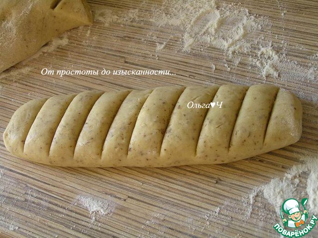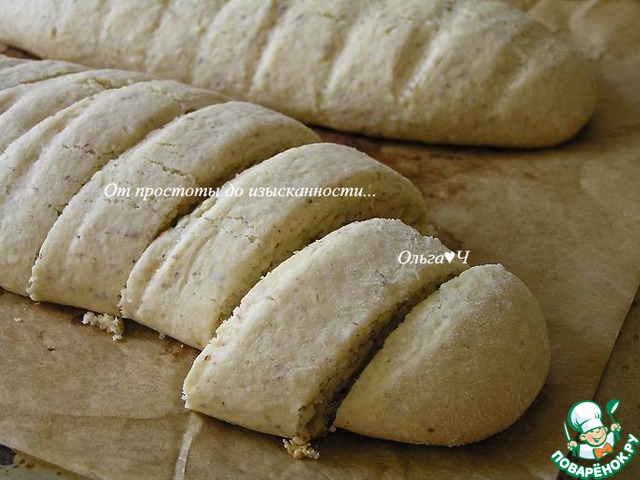 Из полученного теста сформируйте 2 батона, присыпав рабочую поверхность мукой. Каждый батон надрежьте на порционные кусочки толщиной 1-1,5 см. Аккуратно переложите заготовки на противень, застеленный бумагой для выпечки.