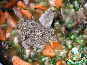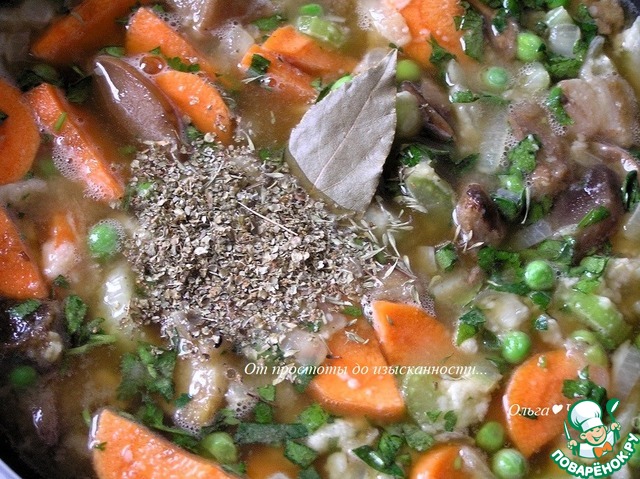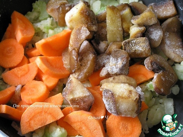 Добавьте все оставшиеся ингредиенты по списку. Морковь и грибы (поскольку у меня были замороженные грибы, то немного потомила).