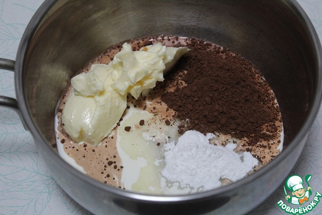 Для глазури все, кроме желатина и воды, выложить в сотейник, очень хорошо размешать, поставить на огонь.