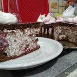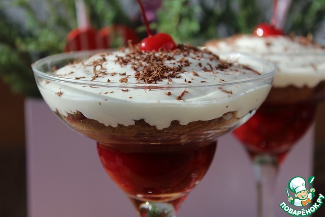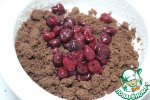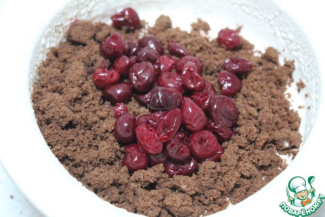 Добавить в сливки вишню (отложить немного вишни) и крошки бисквита ( отложить примерно треть), аккуратно перемешать лопаткой.