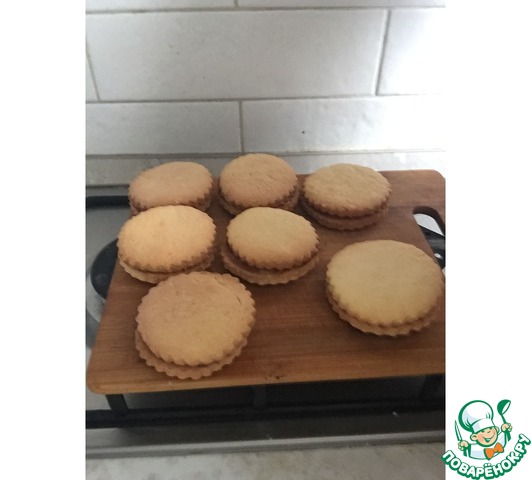 Для прослойки соедините варенье (желательно погуще) с крахмалом. Воду добавьте, ориентируясь на густоту своего варенья. Помешивая, доведите до кипения и остудите. Смажьте половину печений и соедините со второй половиной. И в финале посыпьте сахарной пудрой.