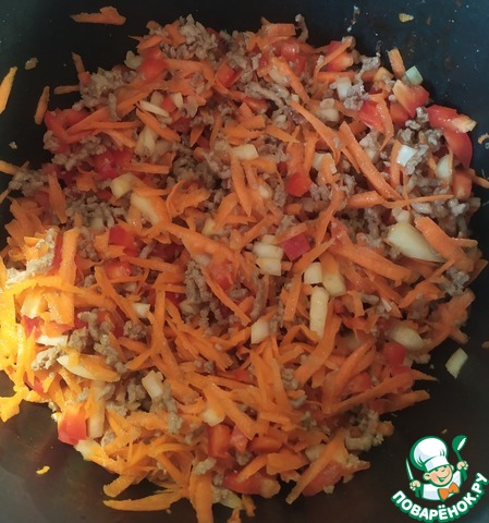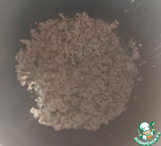 Поджариваю фарш на растительном масле в течение 10 минут, периодически помешивая. Режим "Жарка". В моей мультиварке продолжительность приготовления в этом режиме 20 минут.