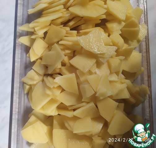 Затем добавляю нарезанный кубиком помидор и ставлю в режим "тушение". В моей мультиварке это 1 час. В это время режу картошку тонкими слайсами, закладываю в чашу, перемешиваю.