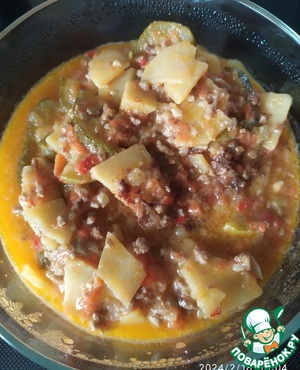 Согласна с предыдущим комментарием, овощи тушить два часа очень долго, при том, что картофель нарезан тонкими слайсами, а цукини вообще надо 10 минут...