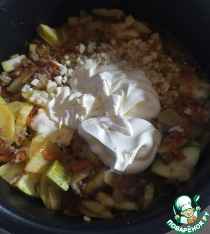 После сигнала мультиварки о готовности пробуем и понимаем что и картофель, и цукини и кабачок сыроваты. Снова запускаем режим тушение. При этом солим, добавляем мелкорубленный чеснок и майонез, перемешиваем. Терпеливо ждем окончания тушения, не забывая иногда помешивать. Минут за 10-15 до конца приготовления пробуем на соль и, если есть необходимость, досаливаем.