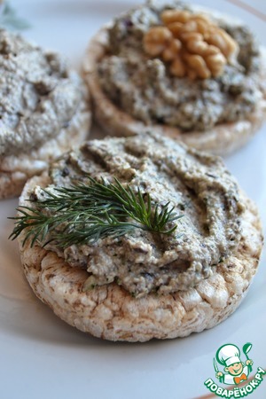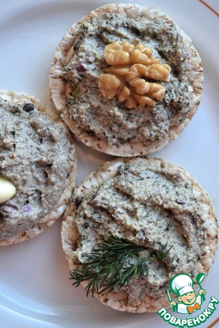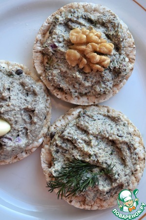 Намазать паштет на хлебцы. По желанию украсить зеленью, орехами, чесноком.