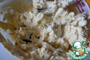 Желтки, чеснок, петрушку и мягкий творог размять вилкой до однородности.