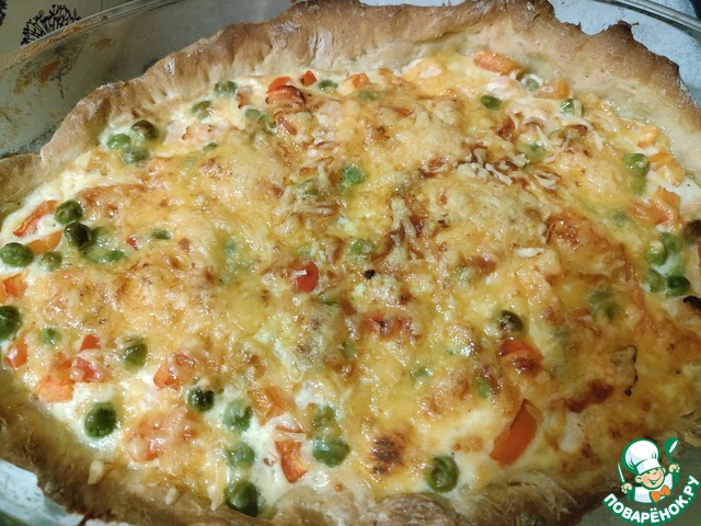 Затем выложите на тесто филе лосося, разобранного на кусочки, горошек и нарезанный сладкий перец, посолите и поперчите по вкусу.