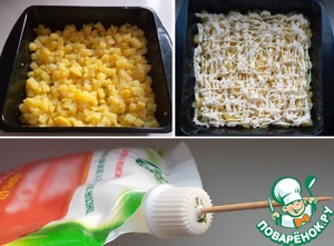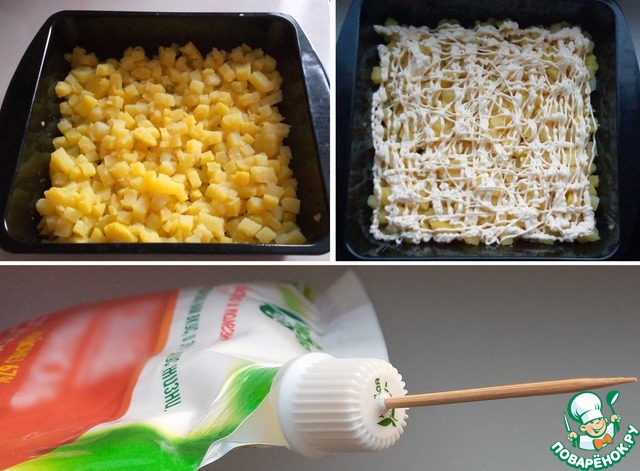 Проткнуть крышку упаковки майонеза и нанести его сеточкой на картошку. -