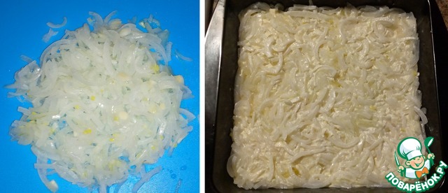 Лук нарезать тонкими полукольцами, залить кипятком и оставить на 10 минут. После, максимально стряхнуть с него всю воду. Выложить вторым слоем, покрыть майонезом.