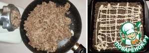 Выложить фарш следующим слоем, нанести немного майонеза, в отличии от других слоёв. -