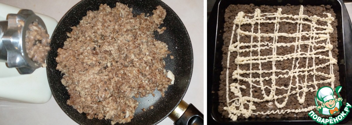 Грибы провернуть мясорубкой. Грибной фарш крепко посолить (можно даже пересолить). На сковороде максимально выпарить из него влагу.