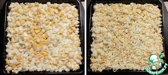 Яйца отварить вкрутую. Очистить, нарезать крупным кубиком или ломтиком. Выложить следующим слоем, покрыть майонезом.