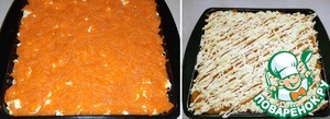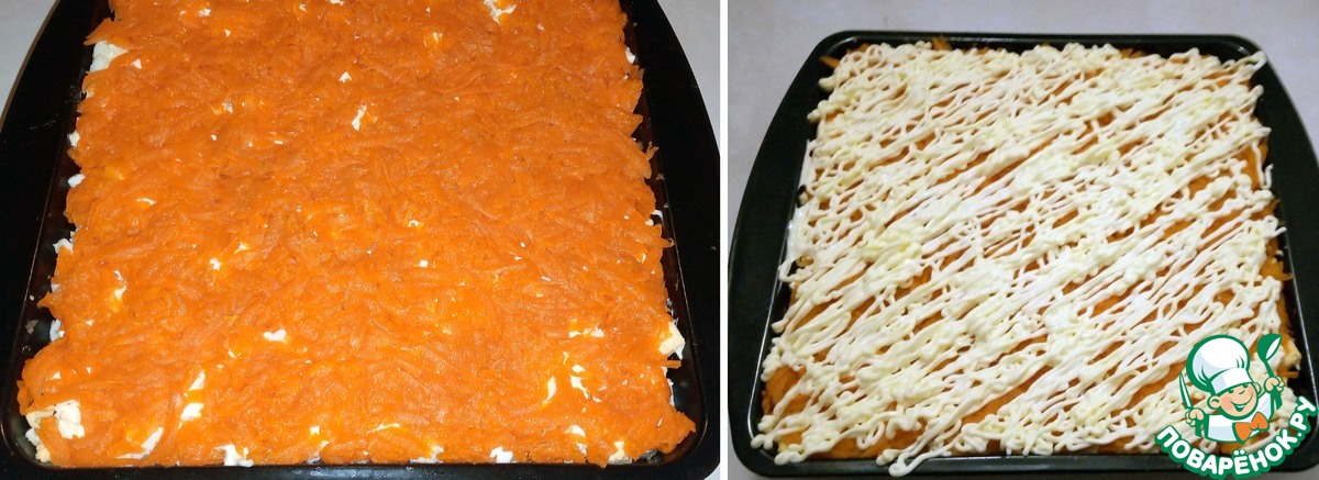 Морковь отварить в мундире, очистить, натереть на крупной тёрке. Выложить слоем.
