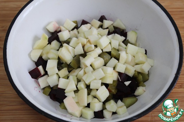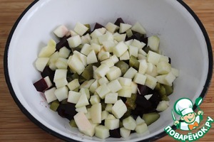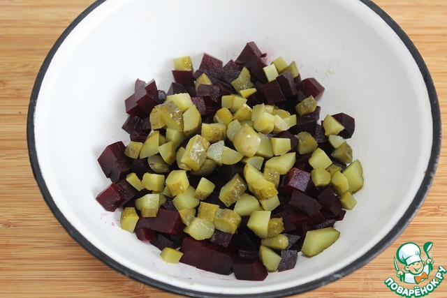 Нарезать такими же по размеру кубиками маринованные огурцы и добавить к свекле.