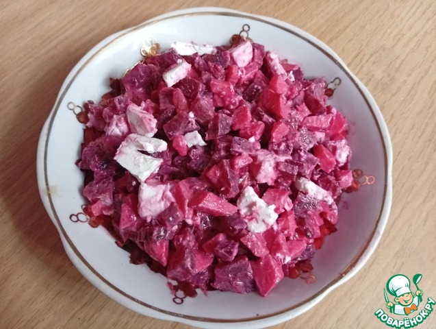 Отваренную и очищенную свеклу нарезать кубиками и сложить в чашу.