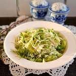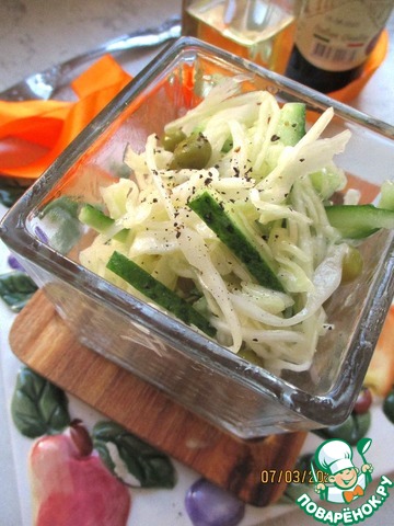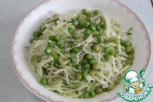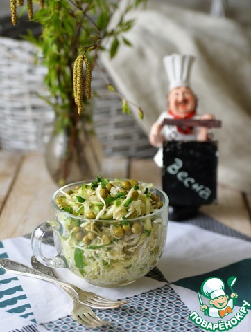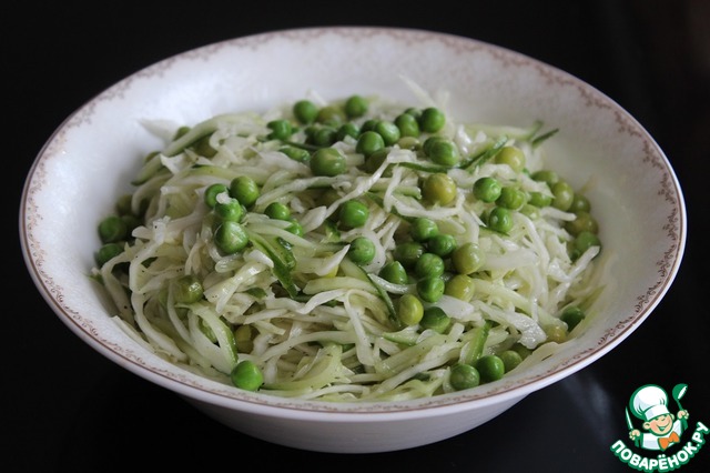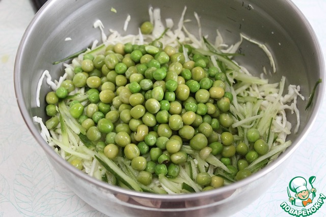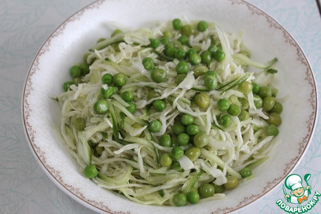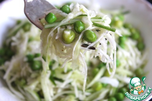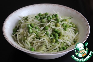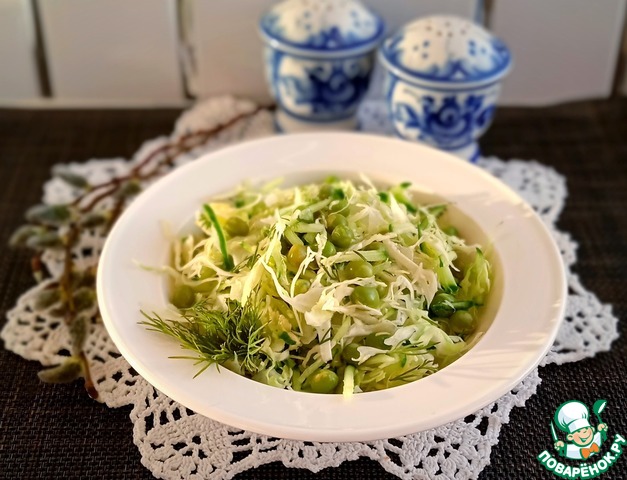 Хрустящий, с легкой кислинкой, освежающий салат - отличное дополнение к домашнему меню. Свежемороженый зеленый горошек, свежий огурец и свежая капуста - отличное сочетание! Капуста попалась с зеленоватым цветом - поэтому три оттенка зеленого)Пробуем?