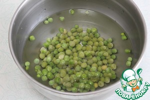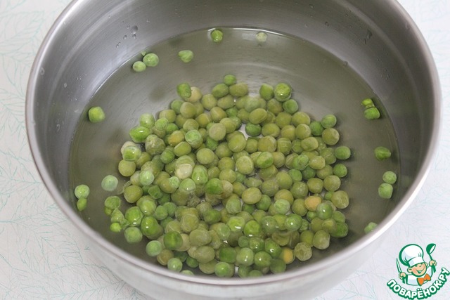 Горошек оттаять в холодной воде, обсушить в дуршлаге.