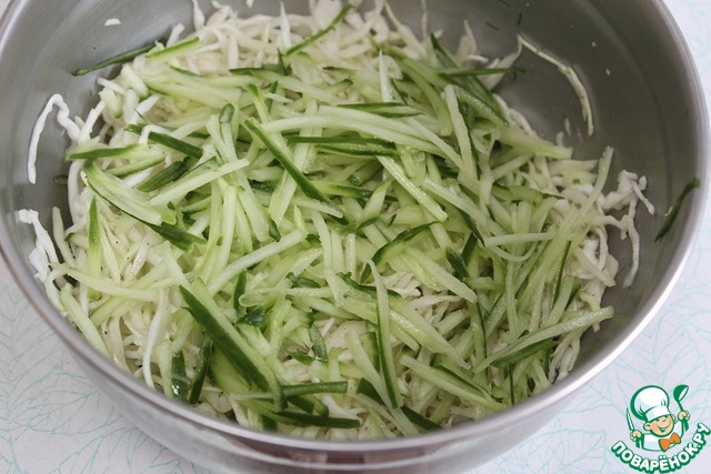 Капусту очень тонко нашинковать, присолить и поперчить.