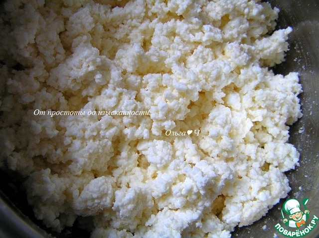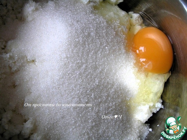 Приготовьте начинку. Если творог крупинками, протрите через сито или немного измельчите с помощью блендера, добавьте яйцо и сахар.