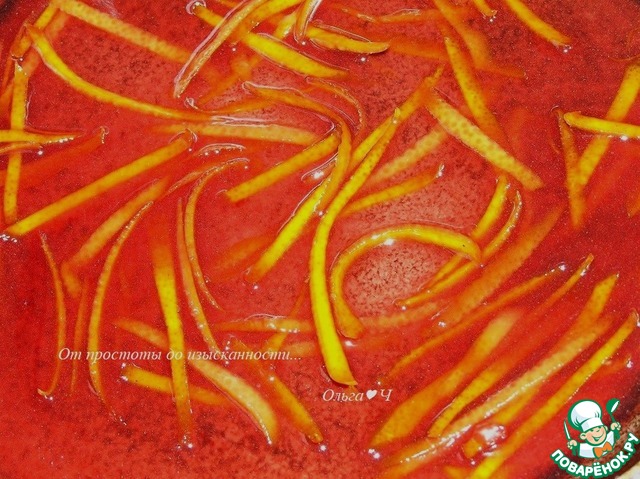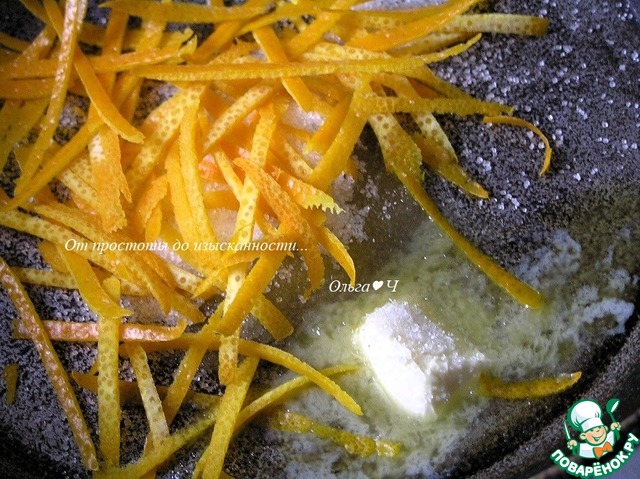 А пока приготовьте соус. Снимите цедру с апельсина с помощью терки. Я в этот раз делала полосочками, мне тоже понравилось. Для этого просто очистите апельсин с помощью овощечистки, а затем нарежьте тоненькими полосками. В сковороде растопите сливочное масло, добавьте сахар и цедру.