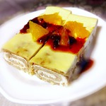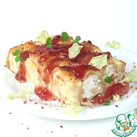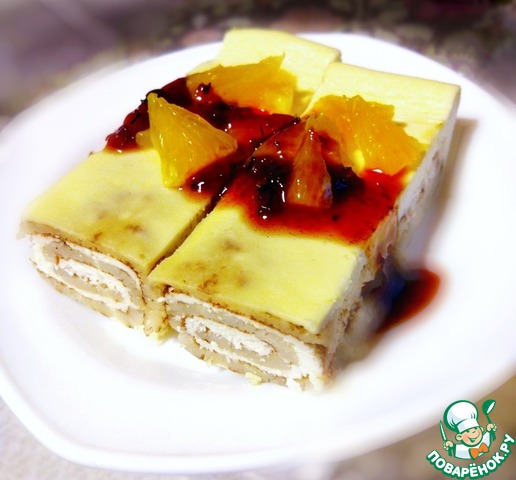 Нежные запеченные блинчики с творожной начинкой в сливочной заливке и вишнево-апельсиновым соусом. Попробуйте!