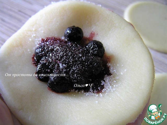 • На каждый кружок положите чайную ложку черники, присыпьте сахаром (можно в сахар добавить немного крахмала, по желанию, но я не добавляла, ни один вареник не лопнул)