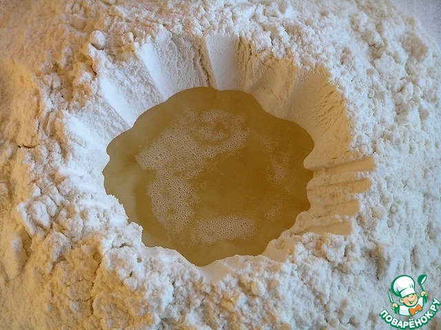 Приготовьте тесто. Муку высыпьте горкой на рабочую поверхность, сделайте углубление и влейте растопленный смалец.