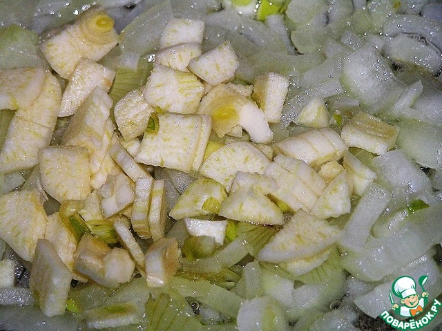 Приготовьте начинку. Обжарьте лук и чеснок на смальце.