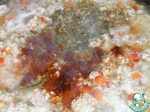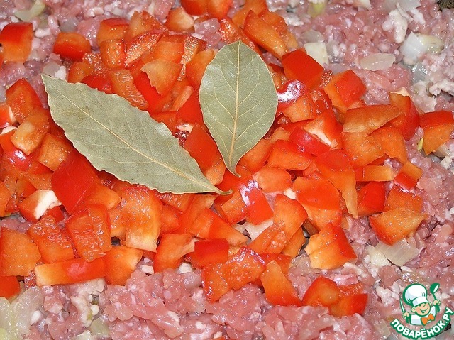 Добавьте свиной фарш, затем мелко нарезанный сладкий перец, лавровые листы, бульонные кубики, посолите, поперчите, перемешайте, и добавьте горячую воду, едва покрыв ею мясо.