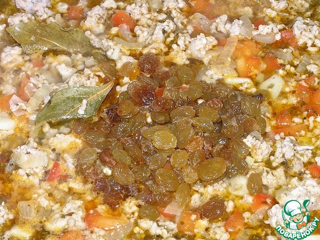 Через пару минут добавьте изюм, перемешайте, тушите еще около получаса.