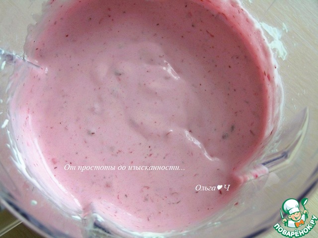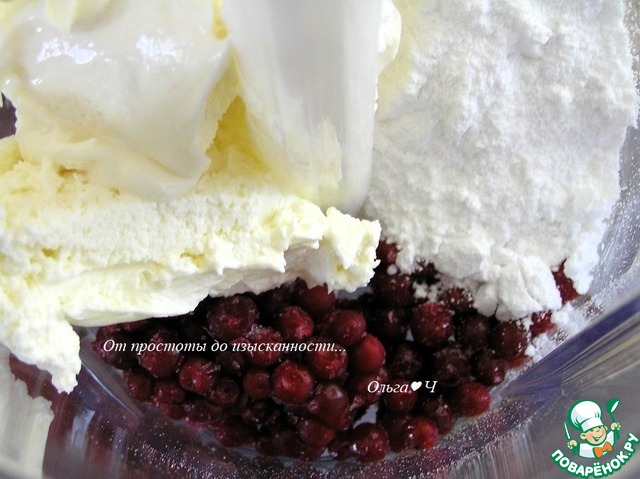 Приготовьте семифреддо. Переберите и промойте бруснику (я просто разморозила), выложите в чашу блендера, добавьте сахарную пудру и маскарпоне.
