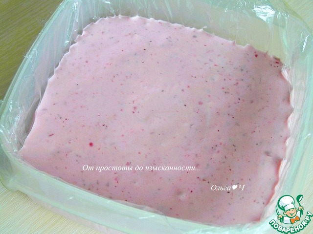 Выложите массу в подходящую емкость, застеленную пищевой пленкой, уберите в морозильную камеру минимум на 3 часа.